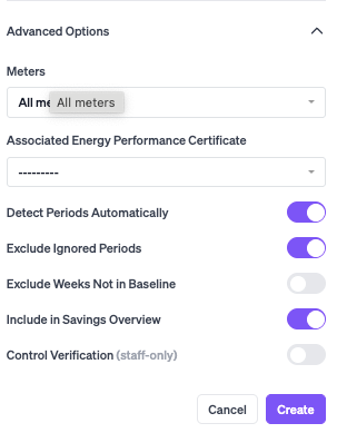 Det ovenstående er standard for verifikationer, men ønsker du at lave manuelle tilpasninger for projektet, kan du gøre dette under Advanced Options. Her kan du vælge din egen baseline og reporting period, inkludere ignorerede perioder eller vælge hvis du kun ønsker verifikationen skal laves på en enkelt måler.
