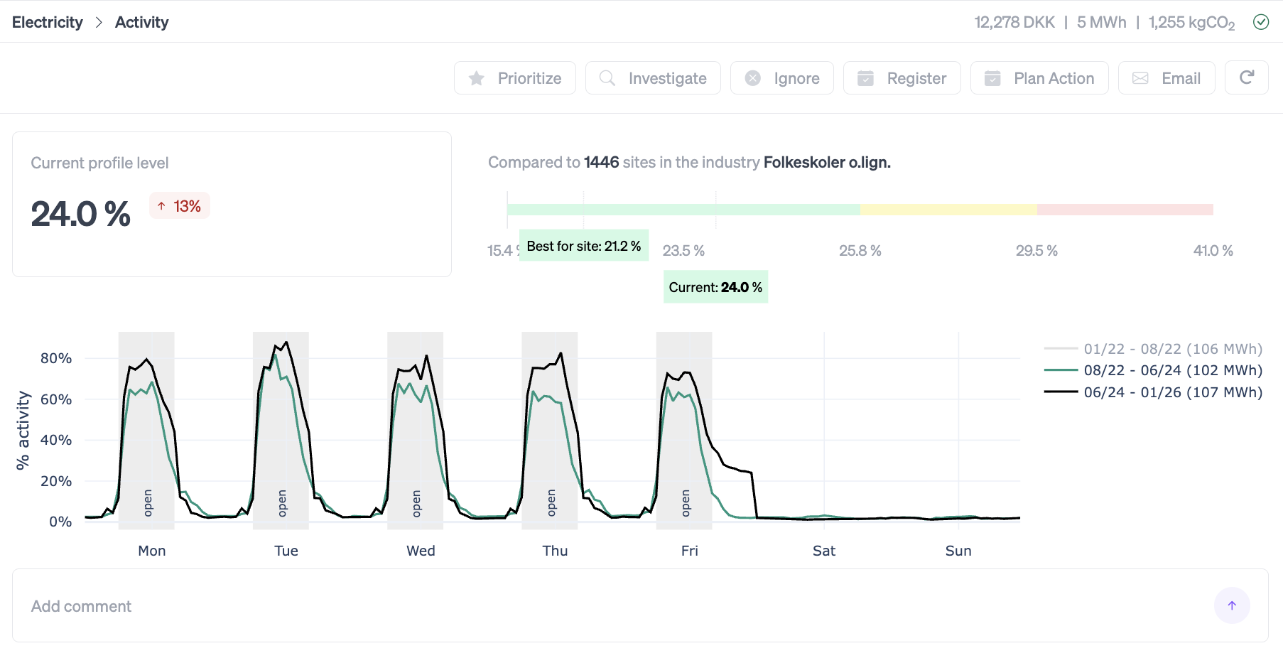 Hvis du ønsker at sammenligne den procentvise aktivitet på tværs af dine bygninger, kan denne data findes under benchmark. Læs mere her.