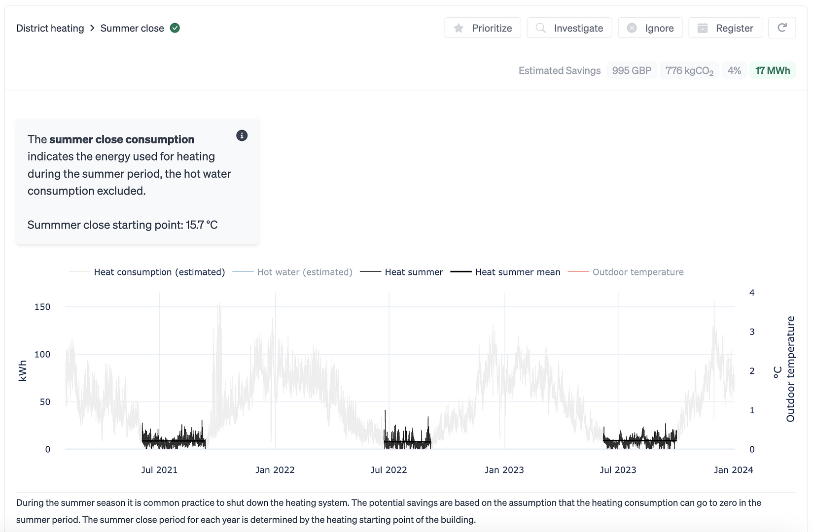 This analysis gives you an overview of the heat consumption during the summer period. The potential for savings is calculated based on the assumption that the building's heating can be turned off during this period and there should be no consumption.