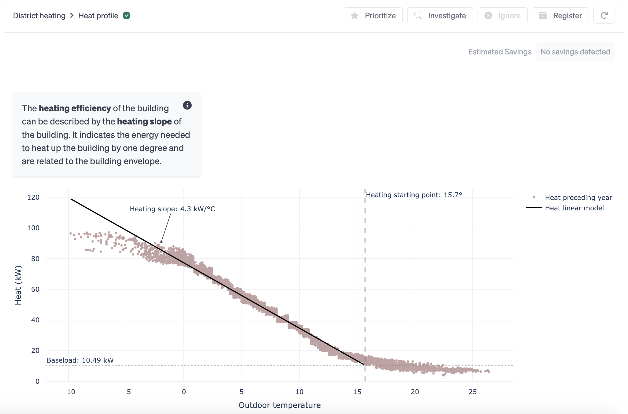 Your heating profile is an analysis of your heat consumption and how it relates to the outdoor temperature. Your heating slope indicates how much energy is used to heat the building degree by degree and relates to the building's climate screen.