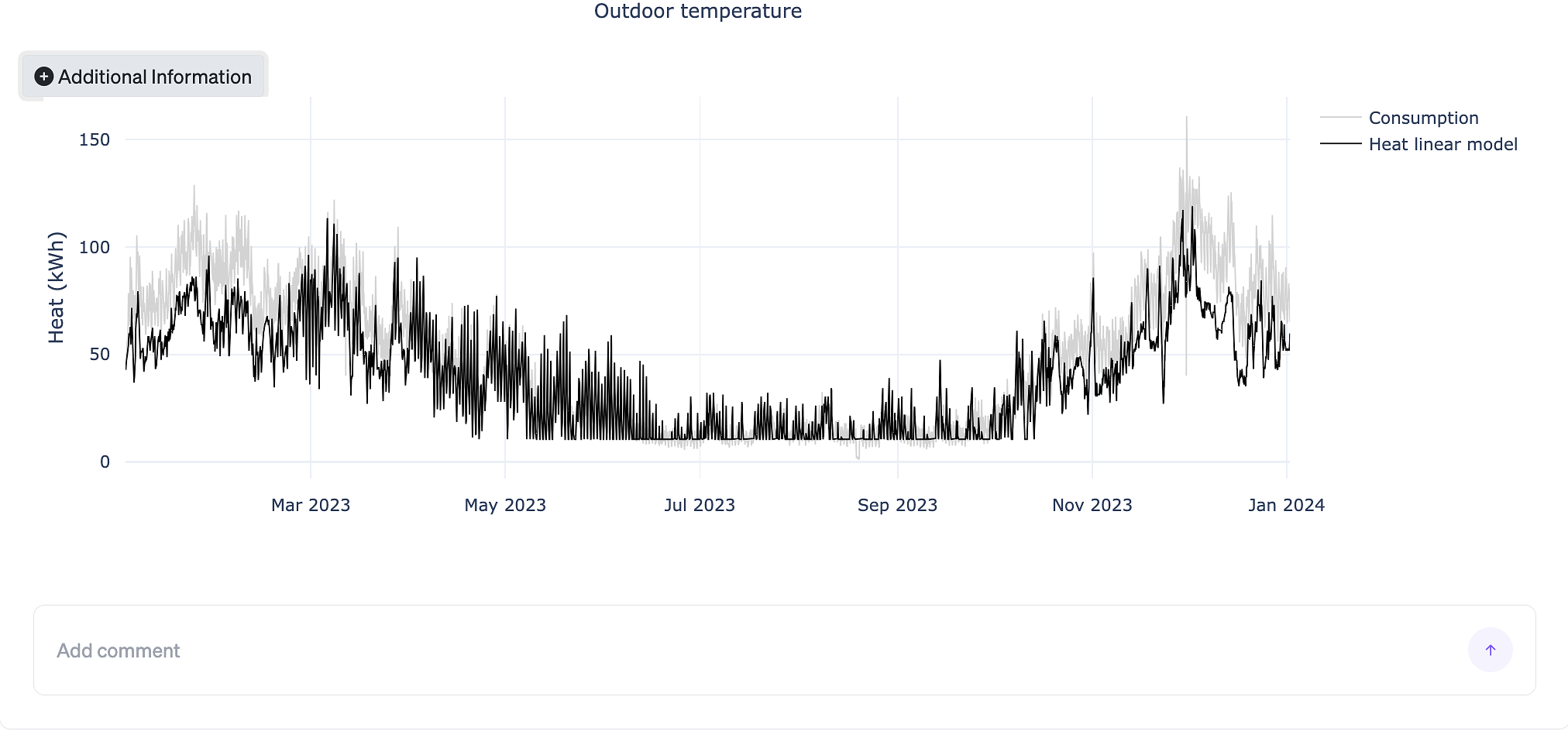 Click on Additional information to get an overview of the past year's consumption (gray) compared to what the consumption would look like if it follows the linear heating slope (black).