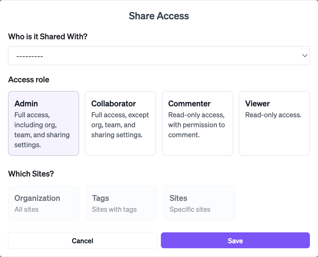 You choose weather you want to share acces with an organisation or with a person, and then you choose the what kind of access they should have. You also choose of they should have access to all sites or a limited number of sites.